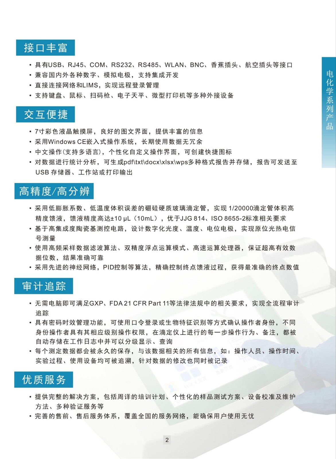 2、具有动态滴定(DET )、等量滴定(MET )、终点滴定(SET)、手工滴定(MAT)等功能模式;